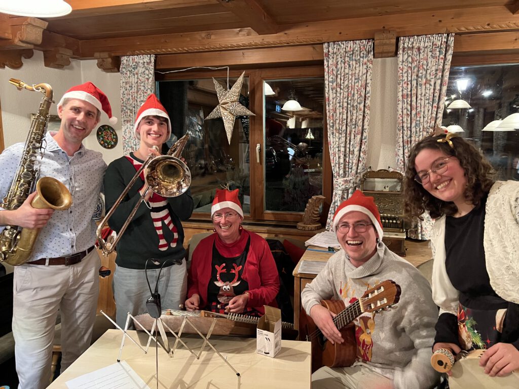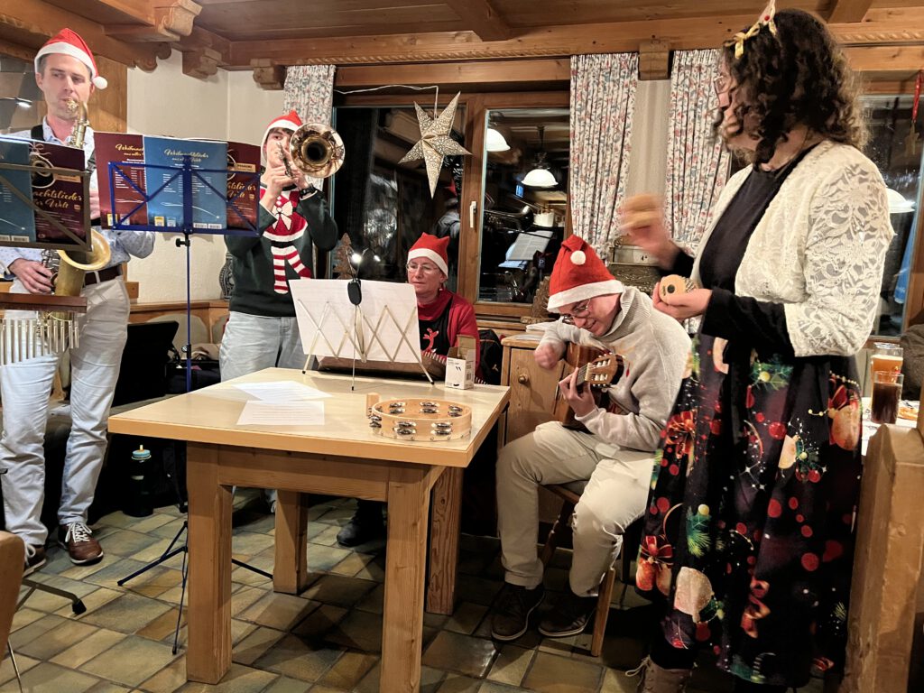 Der nächste Höhepunkt folgte unmittelbar. Familie Huber, bestehend aus Heidi (Hackbrett), Michael (Gitarre), Marinus (Posaune, Akkordeon) sowie Marlies (Tamburin), und Stefan Heigl (Saxophon, Akkordeon) hatten es sich nicht nehmen lassen, die diesjährige Weihnachtsfeier musikalisch zu begleiten und zu umrahmen. Bekannte Weihnachtslieder, unter anderem „Jingle Bells“, „Feliz Navidad“, „Leise rieselt der Schnee“ und „Winter Wonderland“, erfüllten den Raum und taten ihr Übriges, um die Sportfreunde in eine weihnachtlich-festliche Stimmung zu versetzen. Vielen Dank für diese großartige Gemeinschaftsleistung, die sicherlich eine Wiederholung im Rahmen der nächsten Weihnachtsfeier verdient hätte!